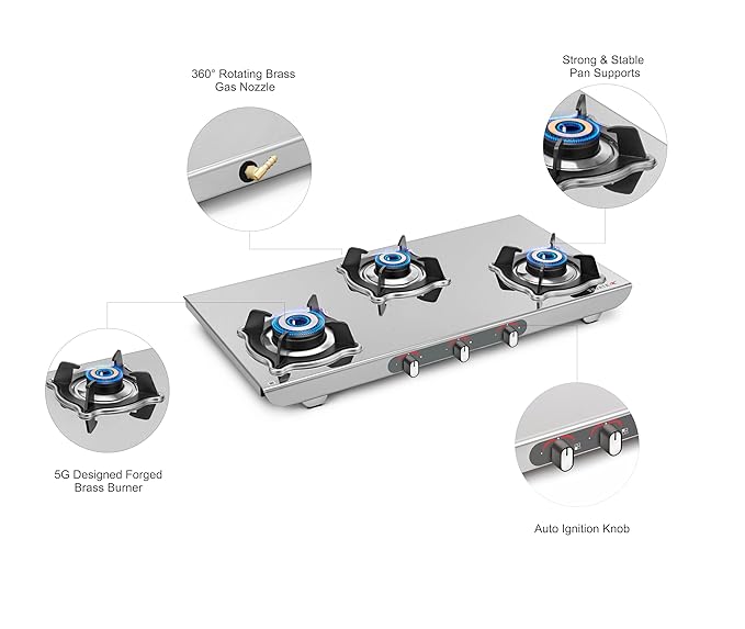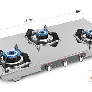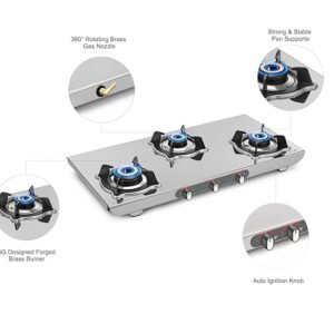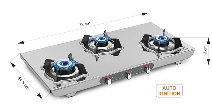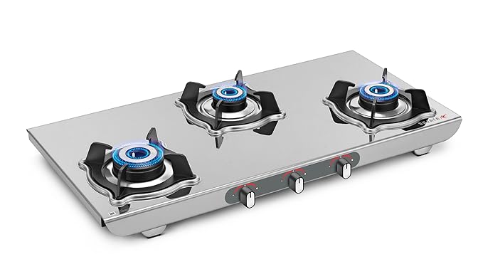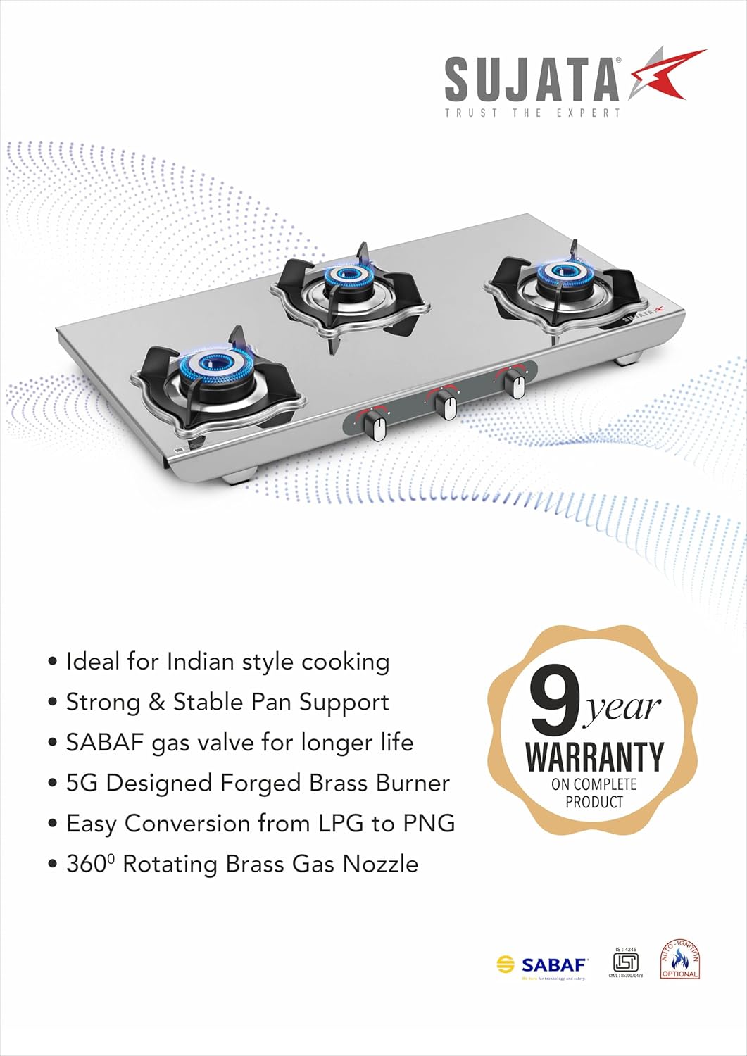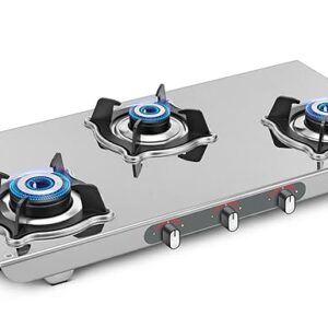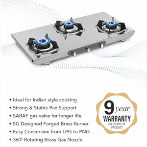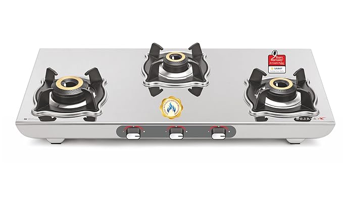 Sujata Gas Stove | 9 Years Warranty | Auto Ignition Gas Stove 3 Burner, Steel Body, SABAF, ISI Certified, LPG & PNG Compatible, Jumbo Pack with Brass Burner (Sterno, Stainless Steel)
